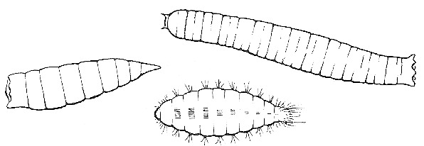 2. Larven langer dan 5mm, veelal zonder haren, zeer uiteenlopende vormenVliegen larven